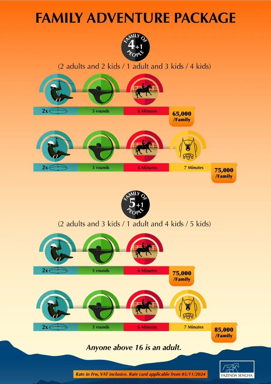 Enjoy unforgettable family fun with our special adventure bundles! Perfect for families of 4 or 5+ people, these packages include zip-lines, archery, horse rides, and more β all at great value.Rates are per family.